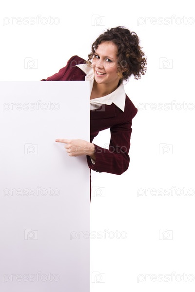 Портрет счастливой бизнес-жены, указывающей на белую пустую карточку на изолированном белом фоне