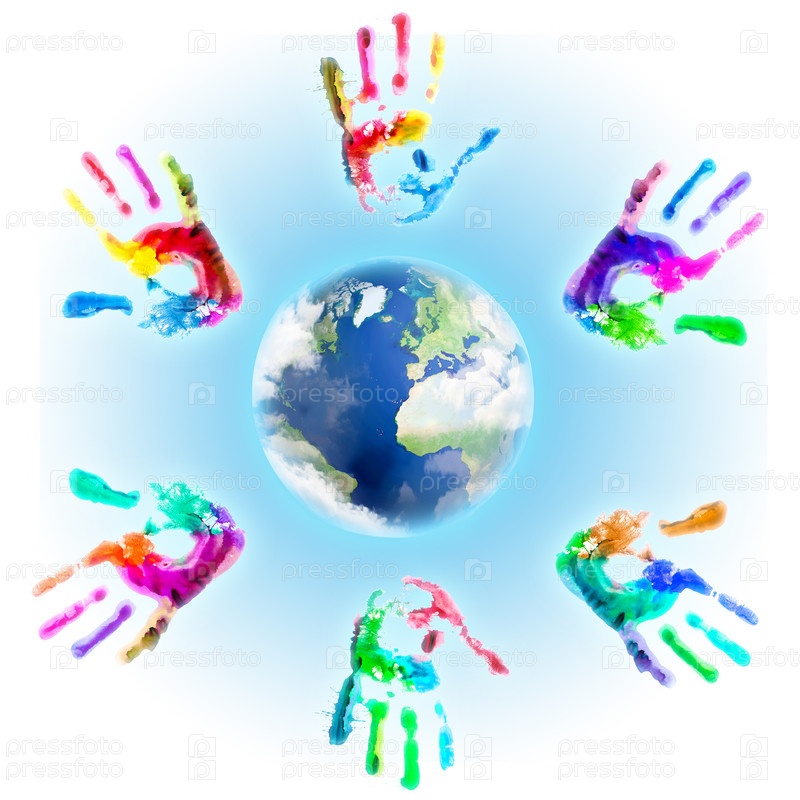 Цветные отпечатки рук вокруг Земли. Символ мира