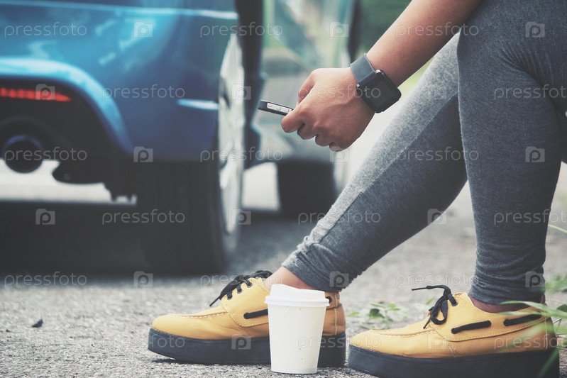 Девушка со смартфоном в руке сидит на обочине дороги