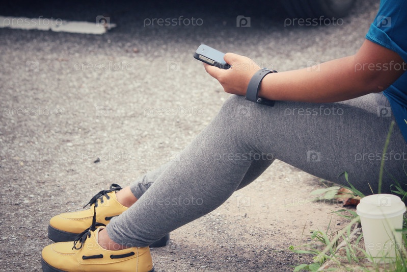 Девушка со смартфоном в руке сидит на обочине дороги