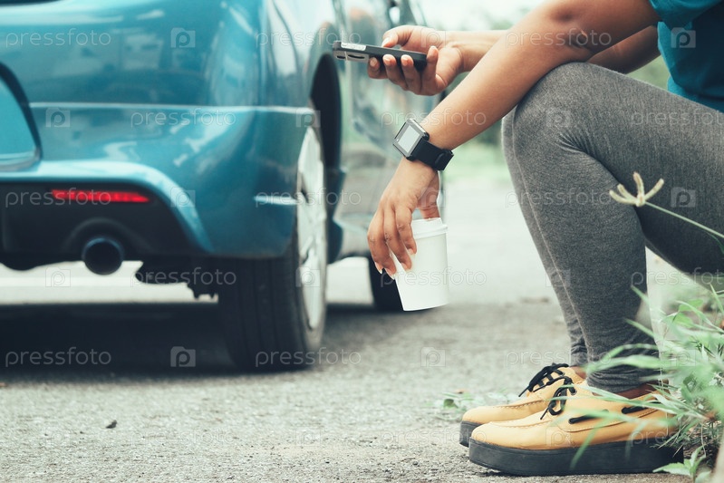 Девушка со смартфоном в руке сидит на обочине дороги