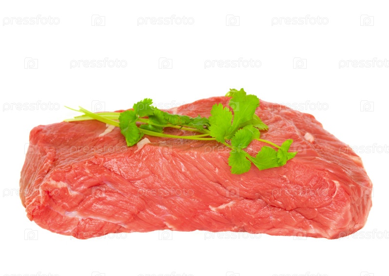 Сырое мясо с веточкой петрушки на белом фоне