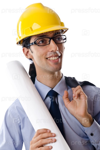Молодой архитектор с чертежами на белом