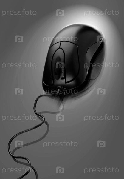 Быстрая серая компьютерная мышь с кабелем и отражением, на абстрактном фоне