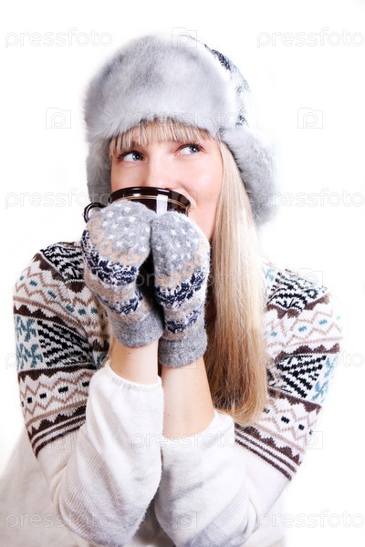 Красивая улыбающаяся женщина в теплой одежде с чашкой кофе