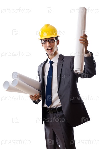 Молодой архитектор с рисунками на белом