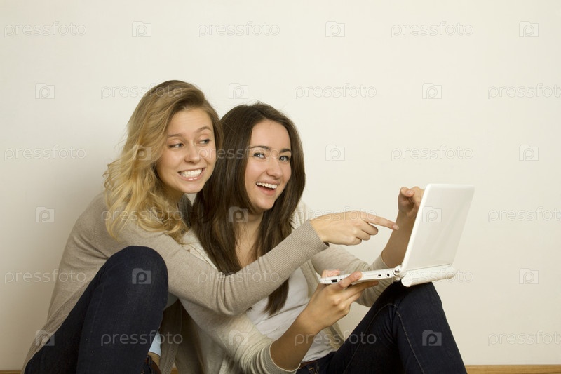 Две подруги сидят с ноутбуком на полу