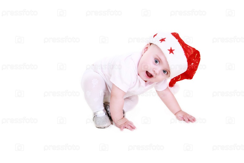 Младенец в новогодней шапочке на белом фоне