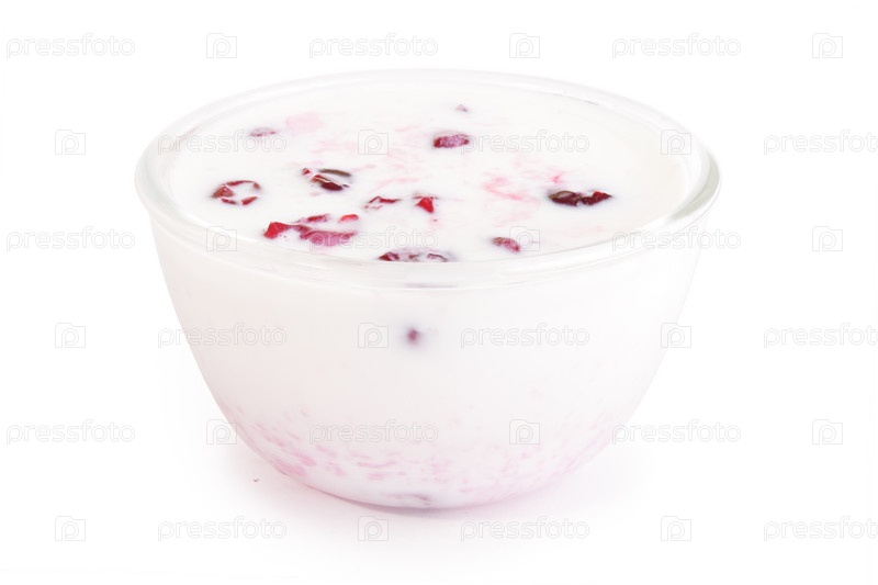 Молоко с вишней на миске на белом фоне