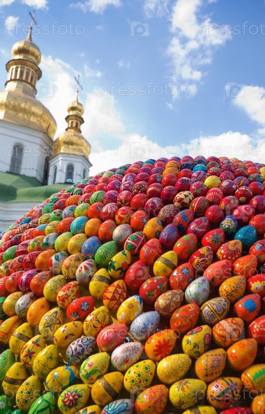 Яркие пасхальные яйца на фоне церкви