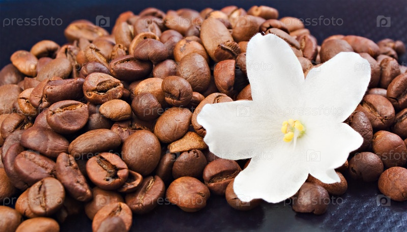 Кофе в зернах с белым цветком