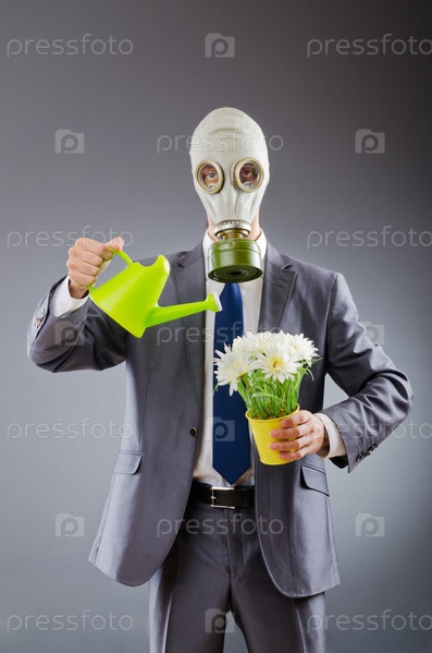 Бизнесмен в противогазе поливает цветы в горшке
