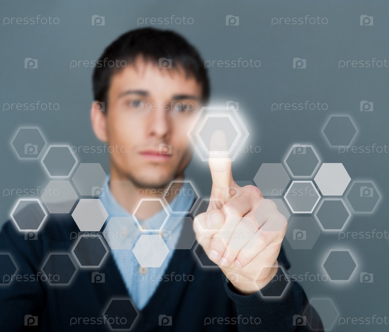 Бизнесмен нажимает виртуальную кнопку