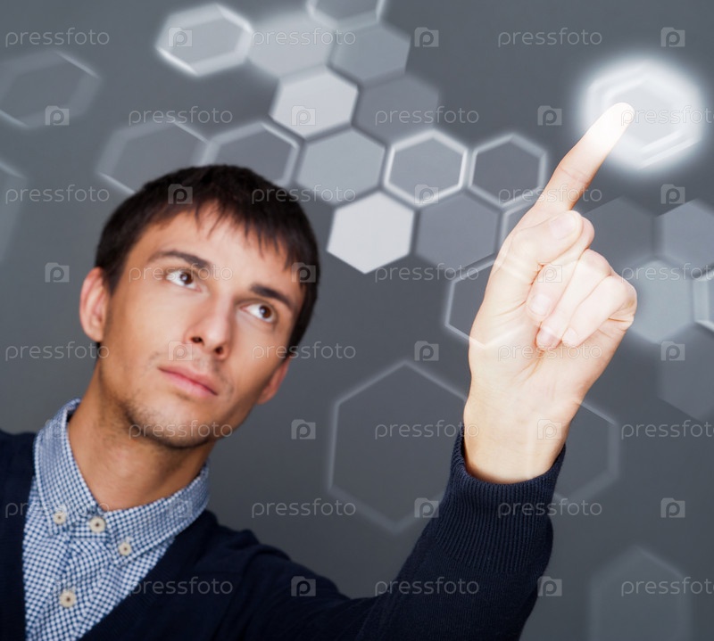 Бизнесмен нажимает виртуальную кнопку