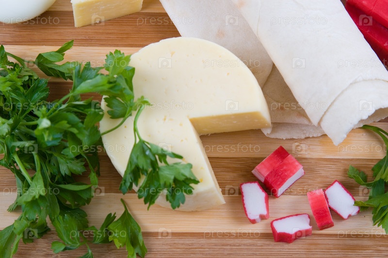 Различные продукты для приготовления салата на деревянной доске