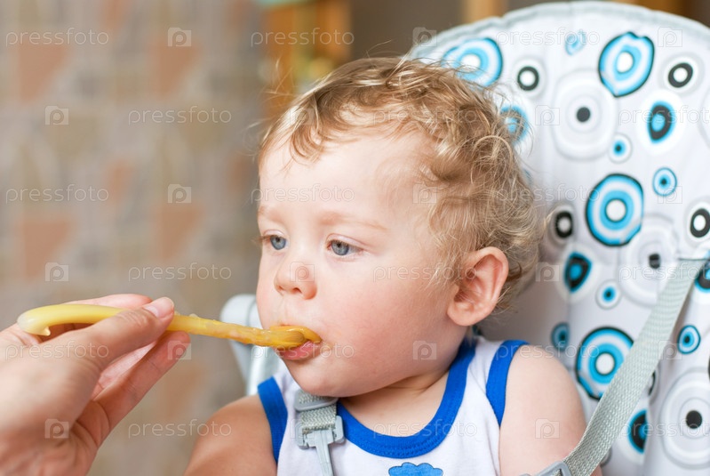 Маленького мальчика кормят с ложки