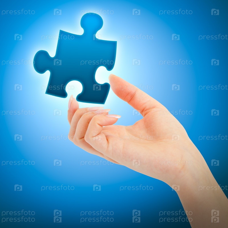 Женская рука с синим кусочком головоломки на фоне синего градиента
