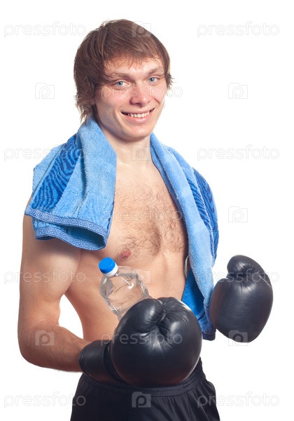 Молодой боксер в черных перчатках на белом фоне