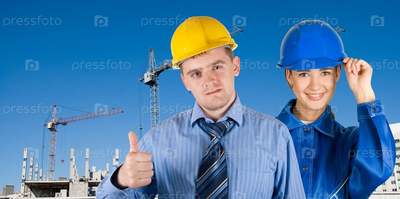 Девушка и парень в касках на фоне строящегося объекта