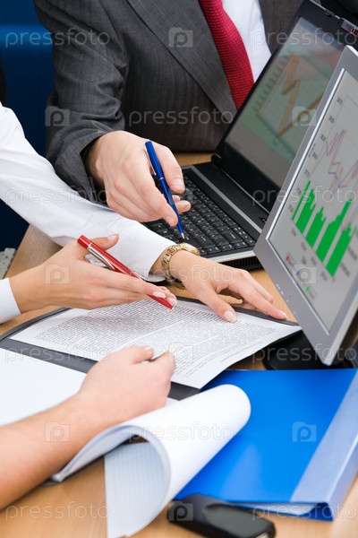 Фото человеческих рук, указывающих на бизнес-текст в рабочей среде