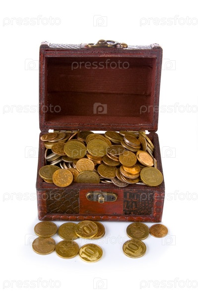 Открытый сундук с монетами на белом фоне