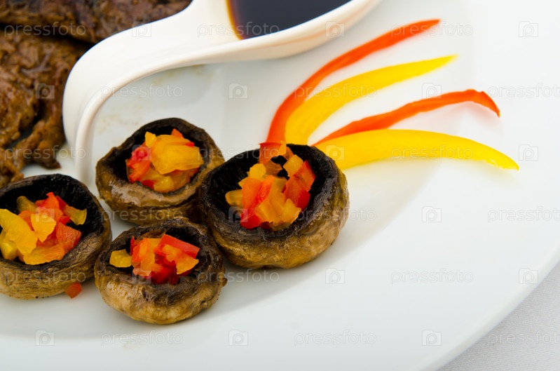 Бифштекс с грибами, овощами и соусом