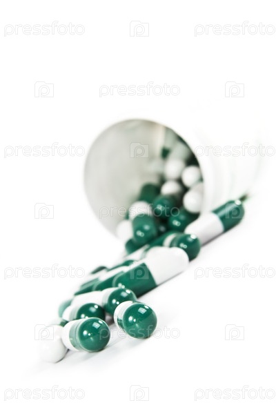 Пузырек с таблетками на белом фоне