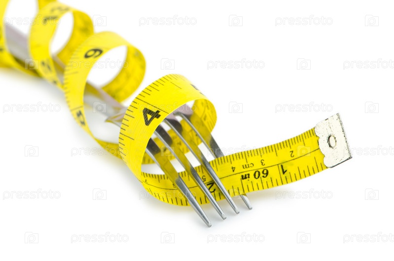 Концепция диеты. Сантиметровая лента на вилке на белом фоне