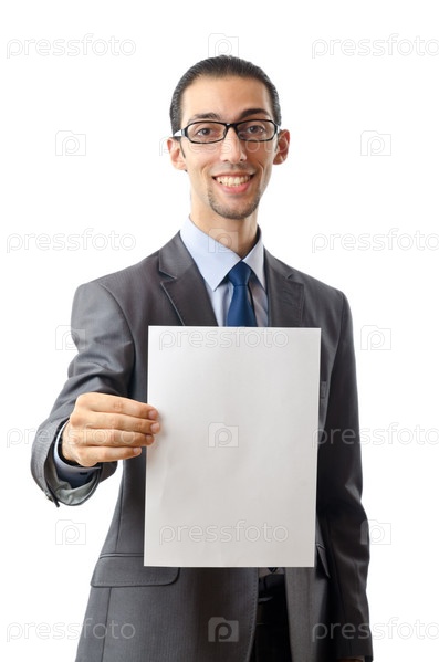 Улыбающийся бизнесмен с чистым листом бумаги на белом фоне