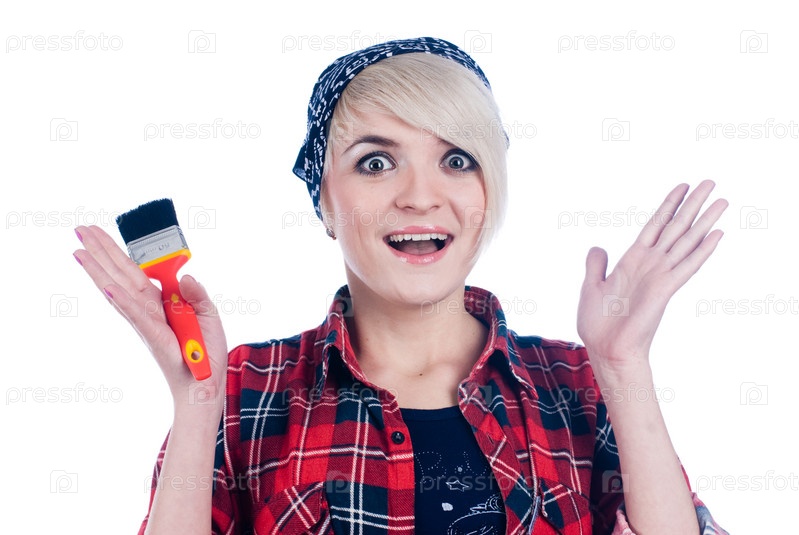 Портрет удивленной блондинки с кисточкой в руке