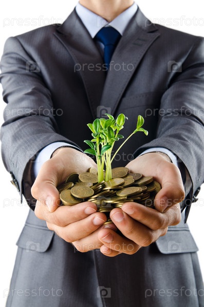 Бизнесмен держит в ладонях ростки, растущие из золотых монет