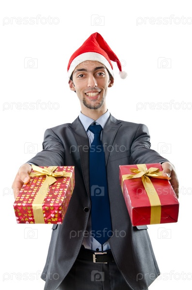 Улыбающийся бизнесмен в новогоднем колпаке с подарками