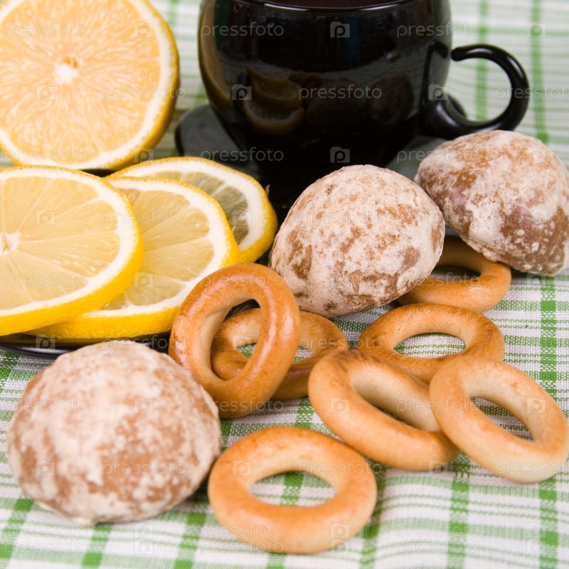 Чашка чая, дольки лимона и десерт на зеленой клетчатой салфетке