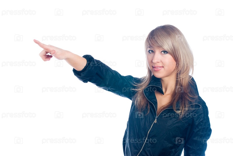 Блондинка указывает пальцем направо