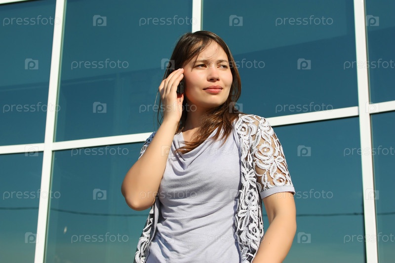 Девушка разговаривает по мобильному телефону, стоя на фоне стеклянной стены