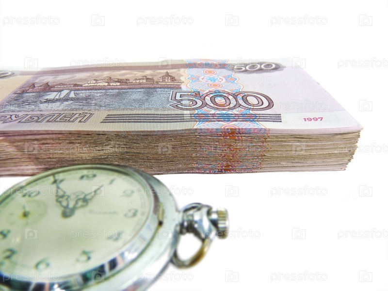 Стопка купюр и часы на белом фоне