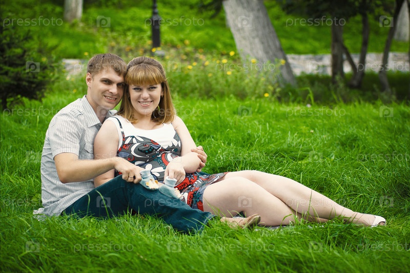 Счастливые будущие родители сидят с пинетками на газоне в парке