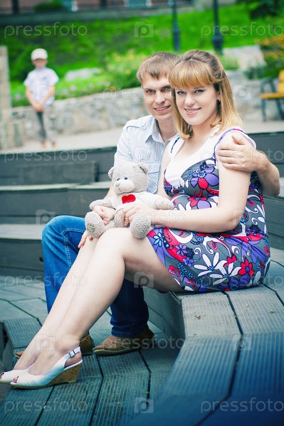 Счастливые будущие родители сидят с плюшевым мишкой на скамейках городской эстрады