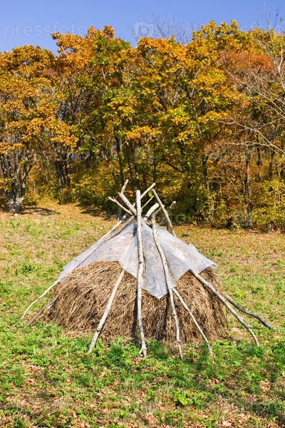 Стог сена на фоне осенних деревьев