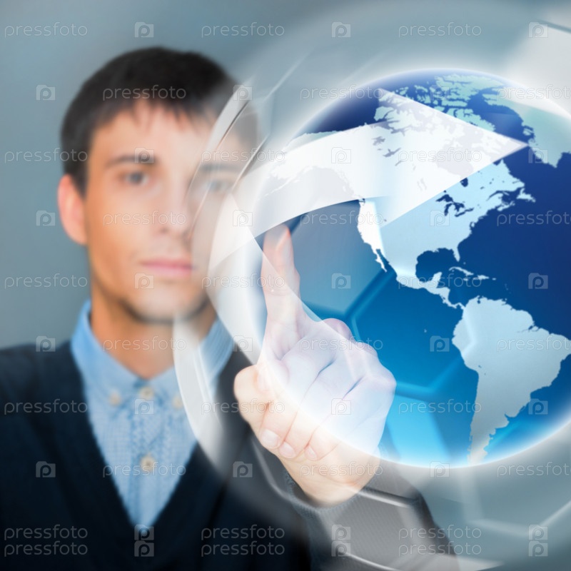 Молодой человек прикасается к виртуальному глобусу. Концепция всемирной сети