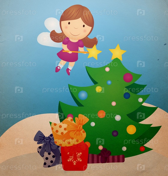 Сказочная фея и рождественская елка с подарками