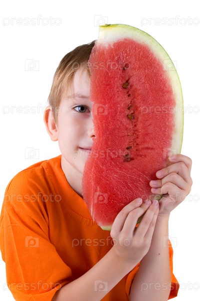 Мальчик с арбузом на белом фоне