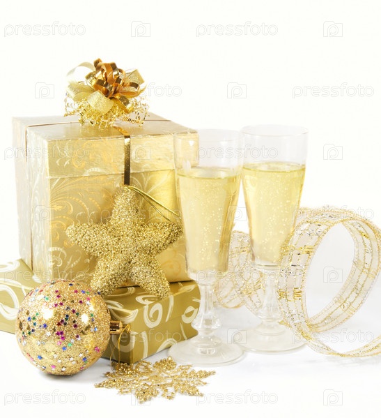 Рождественские натюрморт.Подарочные коробки, украшения и Бокалы шампанского на белом фоне