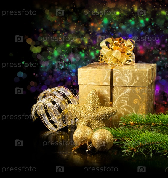 Рождественские натюрморт.Рождественские подарочной коробке, шары и другие украшения