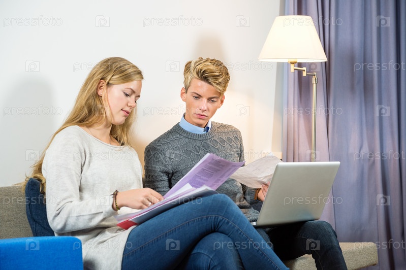 Пара с ноутбуком и документами на диване