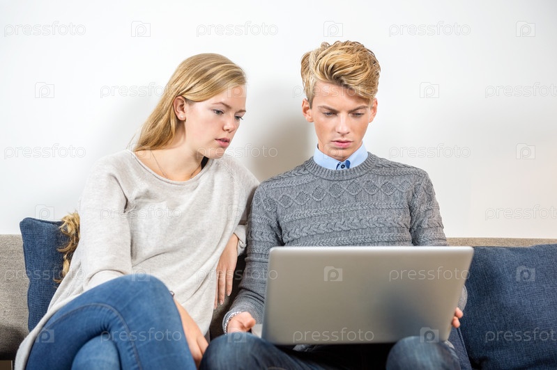 Пара с ноутбуком на диване