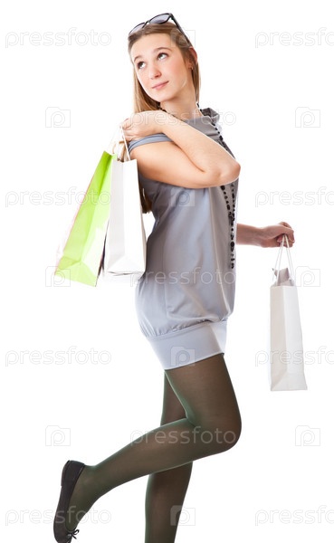 Счастливая девушка с сумками для покупок, изолированная на белом фоне