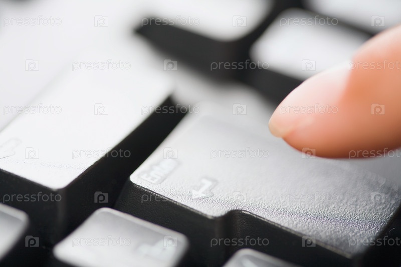 Изображение человеческого пальца, указывающего на клавишу enter на черной клавиатуре