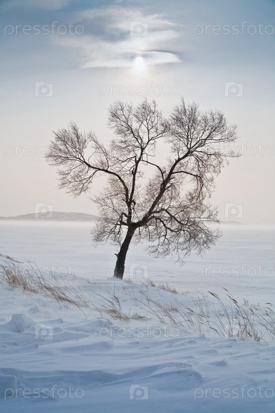 Одинокое дерево в заснеженном поле