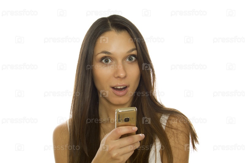 Привлекательная молодая женщина, читает сообщение. Изолированно на белом фоне